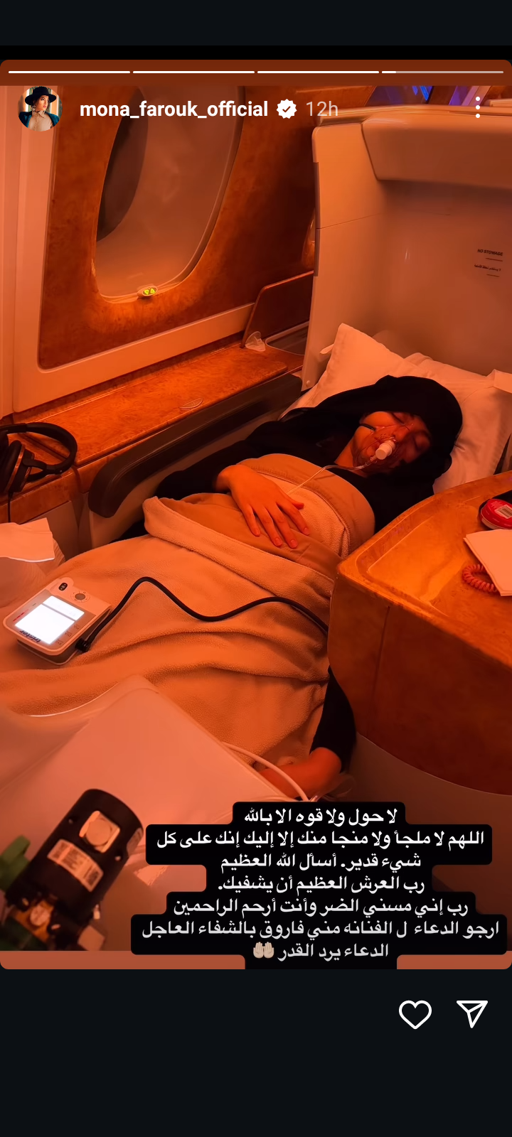 ونشرت الصفحة الرسمية للفنانة منى فاروق على موقع تبادل الصور والفيديوهات انستجرام، من خلال خاصية ستوري صورة لها على أجهزة التنفس رصدها موقع تحيا مصر وعلقوا عليها: "لا حول ولا قوة إلا بالله، اللهم لا ملجأ ولا منجا منك إلا إليك، انك على كل شيء قدير.. أرجوا الدعاء إلى الفنانة منى فاروق بالشفاء العاجل.. الدعاء يغير الأقدار.