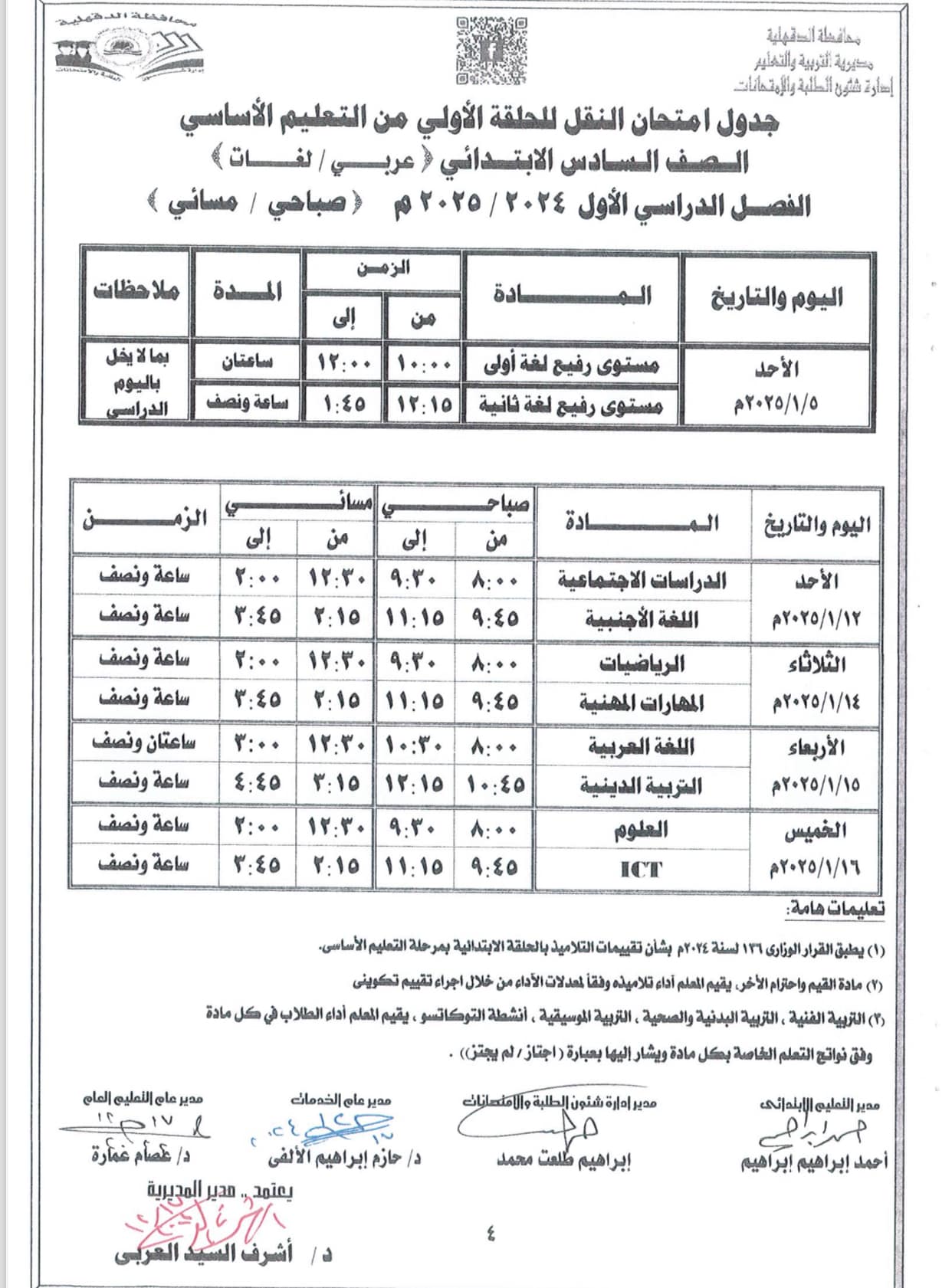 ومن جانبه أوضح الدكتور أشرف العربي وكيل وزارة التربية والتعليم بالدقهلية ان امتحانات النقل للمرحله الابتدائية ستبدأ يوم 11/1/2025 وتنتهي يوم 16/1/2025، وامتحانات النقل للمرحلة الإعدادية العامه والمهنية ستبدأ من يوم 18/1/2025 وتنتهي يوم 23/1/2025 .