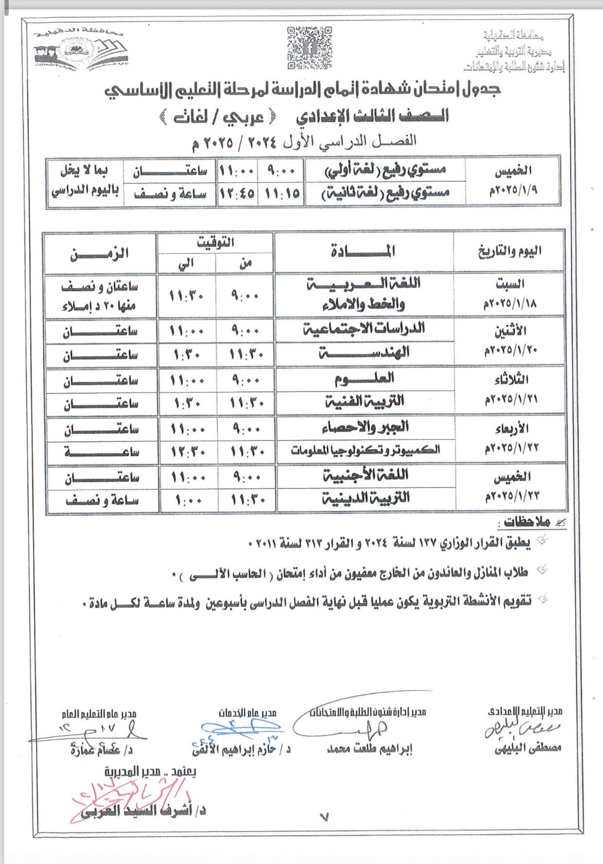 محافظ الدقهلية يعتمد جدول امتحانات الدور الأول لمراحل النقل التعليم الأساسي والشهادة الاعدادية