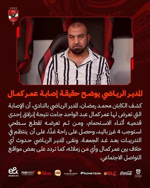 وقال محمد رمضان في بيان رسمي على الصفحة الرسمية للنادي الأهلي، أن الإصابة التي تعرض لها عمر كمال عبد الواحد جاءت نتيجة إنزلاق إحدى قدميه أثناء الاستحمام.