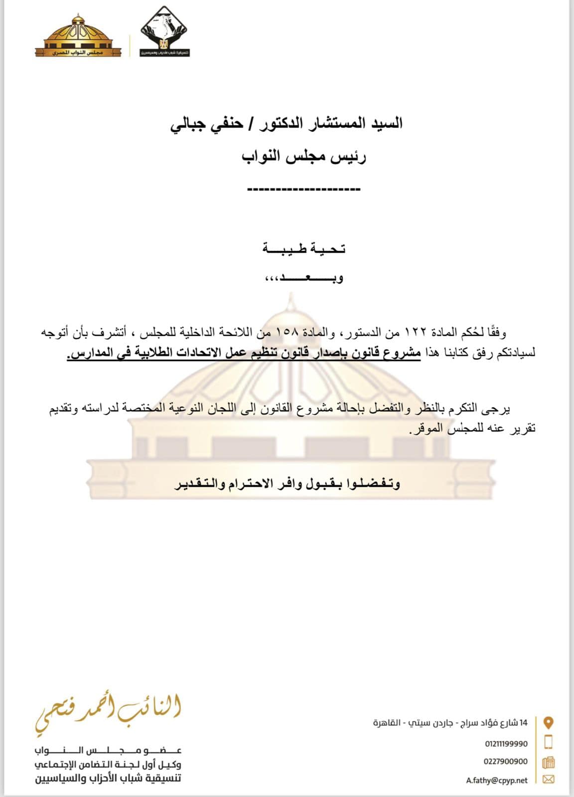 تقدم النائب أحمد فتحي، وكيل لجنة التضامن الاجتماعي بمجلس النواب عن تنسيقية شباب الأحزاب والسياسيين، بمشروع قانون "تنظيم عمل الاتحادات الطلابية في المدارس".