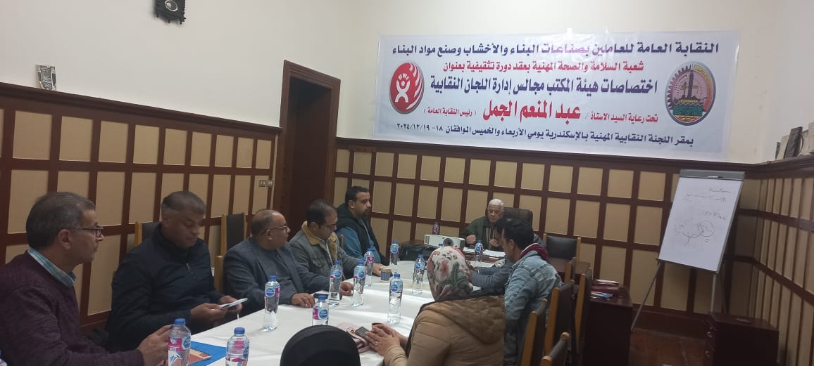 ناقشت النقابة العامة للعاملين بالبناء والأخشاب، برئاسة عبد المنعم الجمل، رئيس الاتحاد العام لنقابات عمال مصر، اختصاصات هيئات مكاتب مجالس إدارات اللجان النقابية، خلال دورة تثقيفية لشعبة السلامة والصحة المهنية.