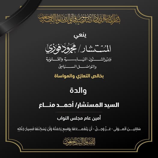 نعى المستشار محمود فوزي، وزير الشئون النيابية والقانونية والتواصل السياسي، والدة المستشار أحمد مناع، أمين عام مجلس النواب.