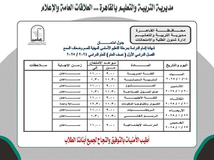 وامتحانات الأول والثاني الثانوى وما يعادله من يوم السبت الموافق ٢٠٢٥/١/١١