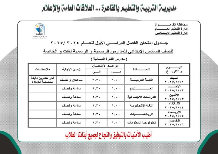 بينما يؤدى طلبة وطالبات الصف الثالث الابتدائى وما يعادله فى الفترة من يوم السبت الموافق ٢٠٢٥/١/١١ حتى يوم الأربعاء الموافق ٢٠٢٥/١/١٥ الرابع والخامس والسادس الإبتدائي وما يعادله