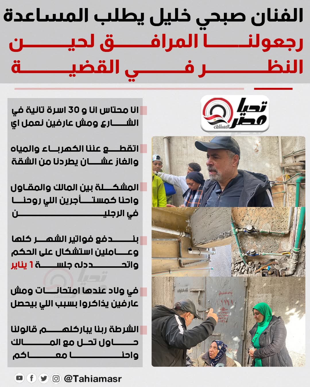 تابع الفنان صبحي خليل حديثه واشتكى من الوضع الحالي بسبب الأزمات التي تواجهه مع جيرانه وبقائهم في الشارع بسبب انقطاع المياه والكهرباء، وقال: "بندفع فواتير الشهر كلها وعاملين استشكال على الحكم واتحد دله جلسة 1 يناير، في ولاد عندها امتحانات ومش عارفين يذاكروا بسبب اللي بيحصل.. الشرطة ربنا يباركلهم قالولنا حاول تحل مع المالك واحنا معاكم".