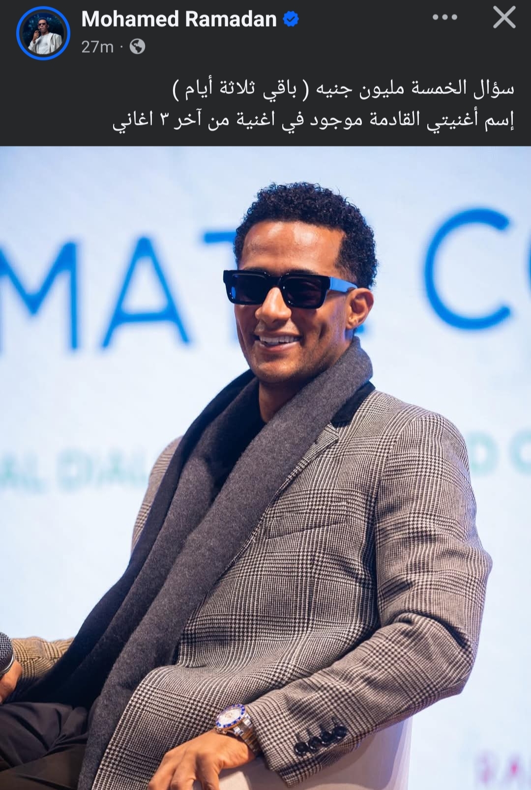 أرفق الفنان محمد رمضان صورة له عبر حسابه الرسمي على موقع التواصل الاجتماعي فيسبوك وعلق عليه مشوقًا الجمهور لأغنيته الجديدة والمسابقة التي كان قد أطلقها وأعلن عن جائزتها والتي تبلغ قيمتها 5 مليون جنيه، و قال محمد رمضان في منشوره الذي يرصده موقع تحيا مصر: "سؤال الخمسة مليون جنيه باقي 3 أيام.. اسم أغنيتي الجديدة موجود في أغنية من آخر ٣ أغاني ليا"، ولقى منشور محمد رمضان تفاعل كبير من جمهوره ومتابعينه الذين بدأوا في تخمين اسم الأغنية.