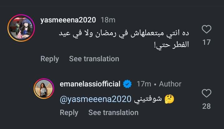 وكتبت أحد المتابعين تعليقا على منشور إيمان العاصي، قالت فيه: "ده انتي مش بتعمليها في رمضان ولا في عيد الفطر"، لترد عليها إيمان العاصي، قائلة: "هو انتي شوفتيني؟".