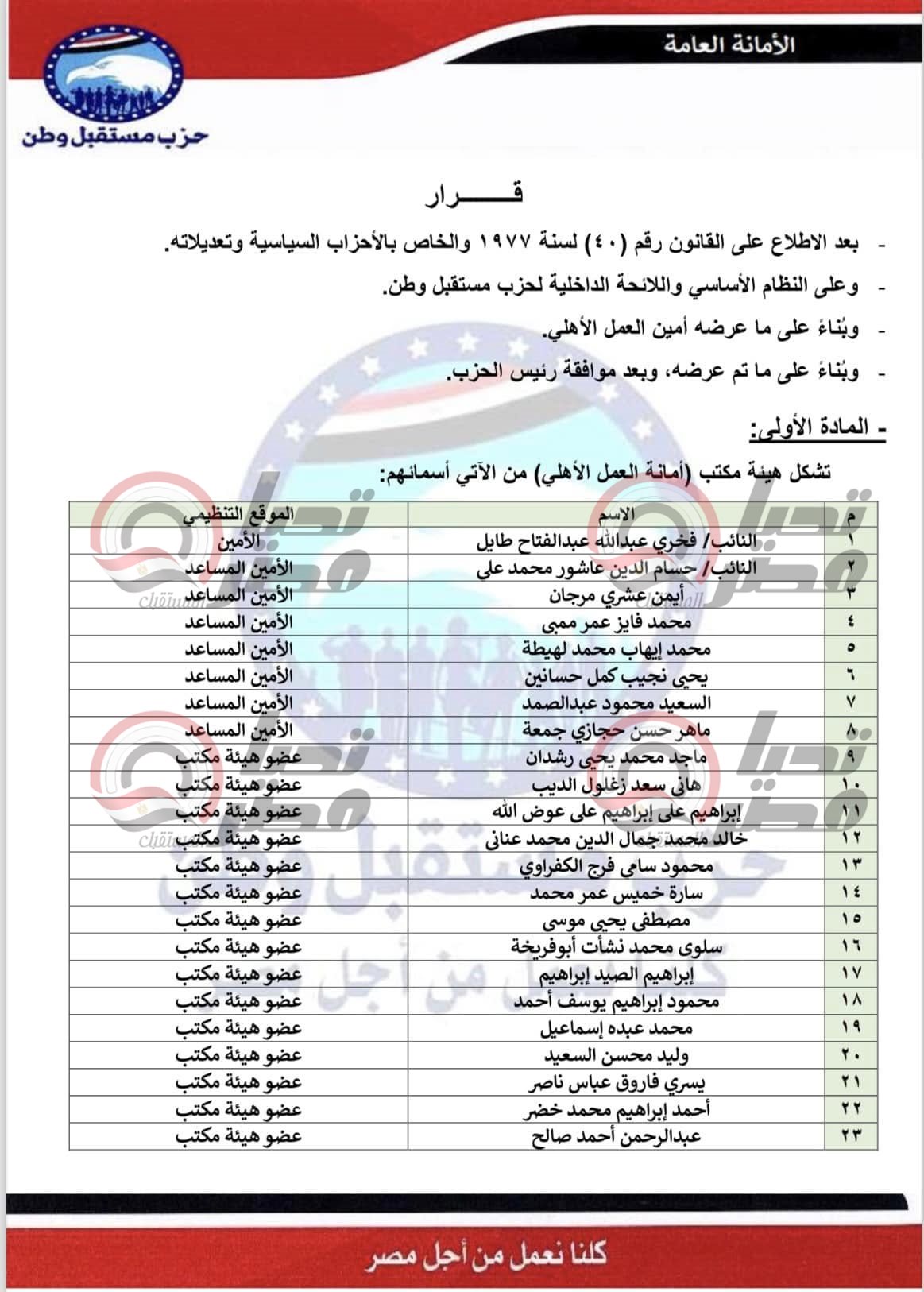 أصدر حزب مستقبل وطن برئاسة المستشار عبد الوهاب عبد الرازق، قرارا بتشكيل أمانة العمل الأهلى برئاسة النائب فخرى طايل ، وذلك في ضوء القرارات الجديدة للحزب بتشكيل الأمانات المركزية.