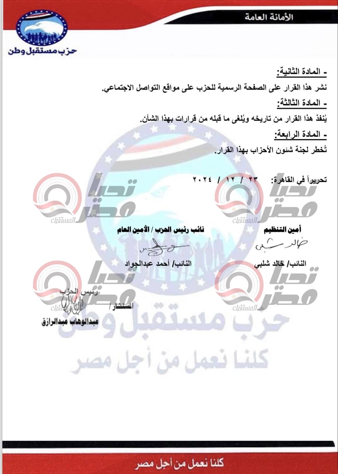 وكان حزب مستقبل وطن برئاسة المستشار عبد الوهاب عبد الرازق، قد أصدر قرارا بتشكيل أمانة المصريين بالخارج برئاسة النائب محمود حسين، وذلك في ضوء القرارات الجديدة للحزب بتشكيل الأمانات المركزية.