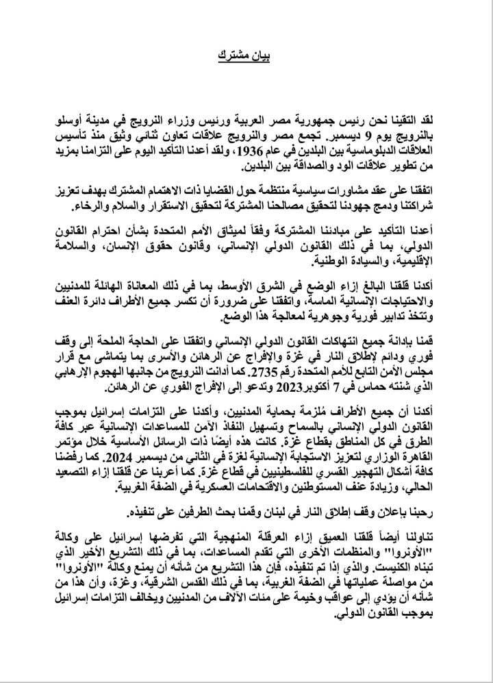 صدر بيان مصرى - نرويجى مشترك، والذي تم الاتفاق عليه بين البلدين في إطار متابعة نتائج زيارة الرئيس عبد الفتاح السيسي إلى العاصمة النرويجية أوسلو، خلال الفترة من 8 إلى 10 ديسمبر 2024، وذلك ضمن الجولة الأوروبية للرئيس.