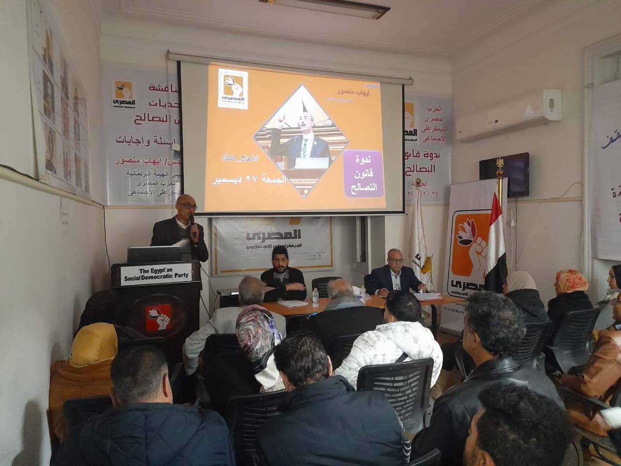 نظم الحزب المصرى الديمقراطى الاجتماعى ندوة لمناقشة مشاكل قانون التصالح، شهدت حضورًا حاشدٌا من المواطنين، تحدث فيها المهندس إيهاب منصور، رئيس الهيئة البرلمانية للحزب والمستشار حسني سبالة، عضو الهيئة العليا.