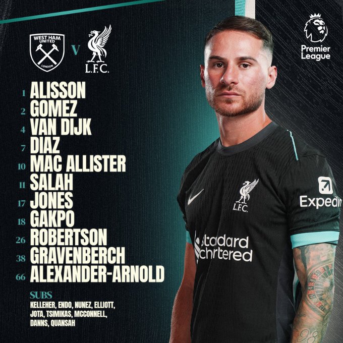 التشكيل الرسمي لمباراة ليفربول ووست هام يونايتد في الدوري الإنجليزي الممتاز