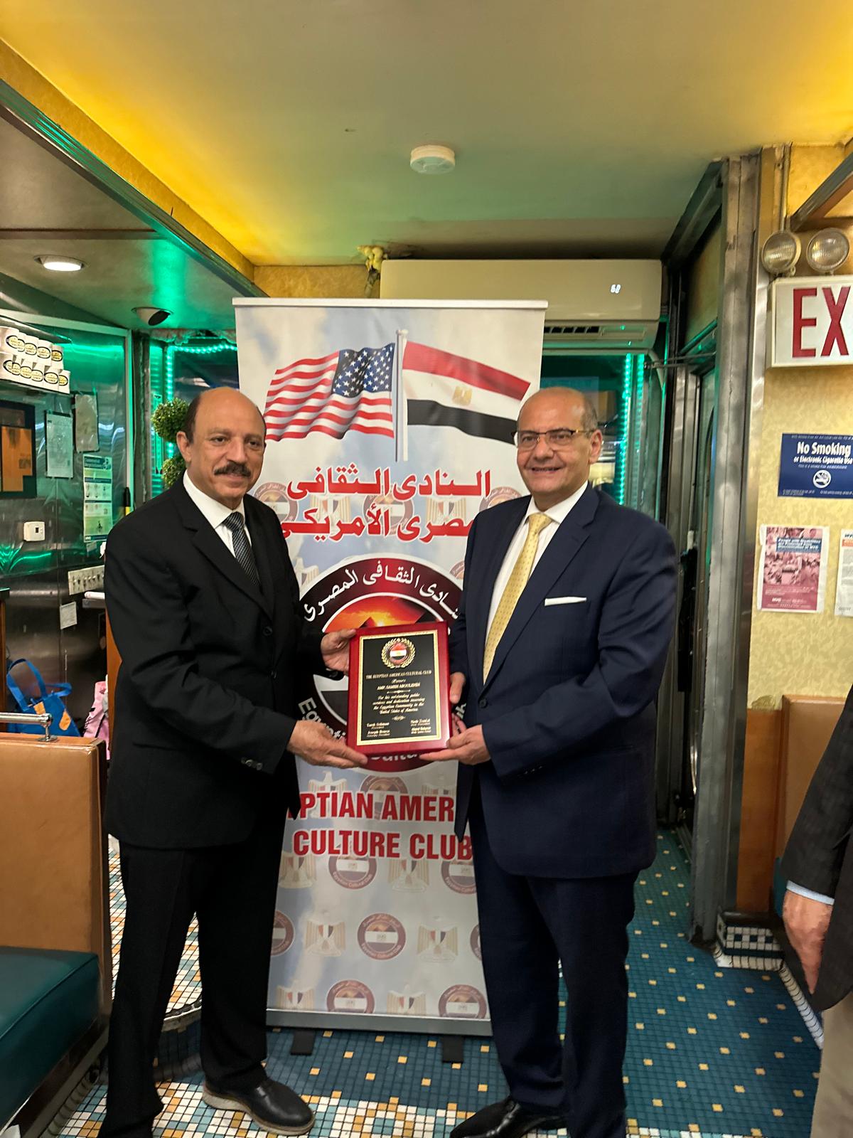 وأهدي مجلس إدارة النادي الثقافي المصري الأمريكي ورئيس الجمعية العربية الامريكية، درع "افضل دبلوماسي لعام ٢٠٢٣ "تقديرا لجهوده في خدمه الجاليات المصرية والعربية في المهجر خلال فتره عمل سيادته بالولايات المتحدة.