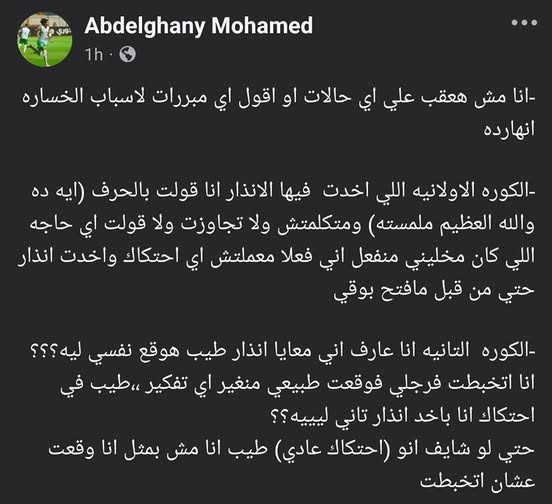 وتابع عبد الغني محمد، متكلمتش تاني ولا تجاوزت مع الحكم ولا قولت أي حاجه واللي كان مخليني منفعل أني فعلا معملتش أي احتكاك وأخدت إنذار حتى من قبل ما أتكلم.