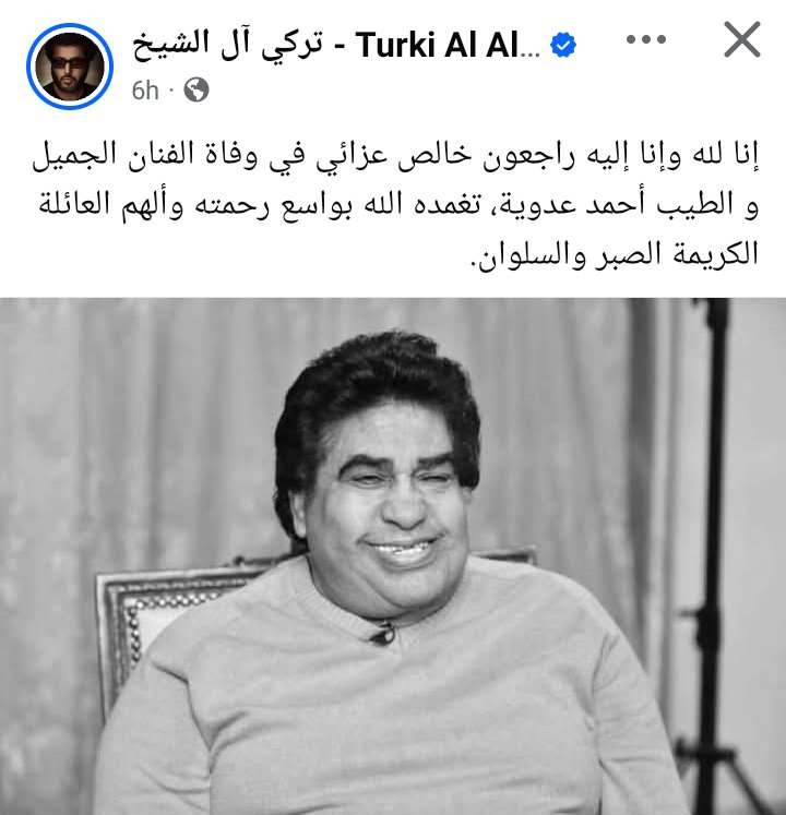 ونشر تركي آل الشيخ صورة للفنان أحمد عدوية عبر حسابه الرسمي بموقع التواصل الاجتماعي فيسبوك في منشور رصده موقع تحيا مصر، وعلق عليها قائلا: إنا لله وإنا إليه راجعون خالص عزائي في وفاة الفنان الجميل و الطيب أحمد عدوية، تغمده الله بواسع رحمته وألهم العائلة الكريمة الصبر والسلوان.