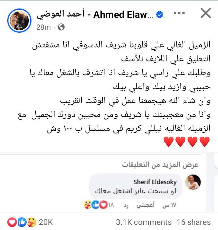 وأعاد أحمد العوضي نشر طلب شريف الدسوقي عبر حسابها الرسمي بموقع التواصل الاجتماعي فيسبوك، في منشور رصده موقع تحيا مصر وعلق عليه، قائلا: الزميل الغالي علي قلوبنا شريف الدسوقي انا مشفتش التعليق علي اللايف للأسف وطلبك علي راسي يا شريف انا اتشرف بالشغل معاك يا حبيبي وازيد بيك واعلي بيك وان شاء الله هيجمعنا عمل في الوقت القريب.