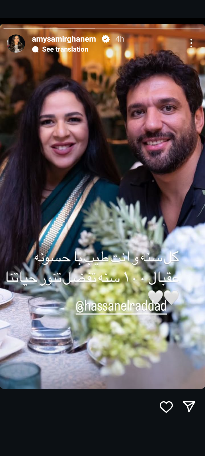 ونشرت إيمي سمير غانم صورة لها رفقة زوجها حسن الرداد عبر حسابها الرسمي بموقع تبادل الصور والفيديوهات انستجرام من خلال خاصية ستوري، في منشور رصده موقع تحيا مصر وعلقت عليه، قائلة: كل سنة وانت طيب يا حسونة وعقبال 100 سنة وانت منور حياتنا.