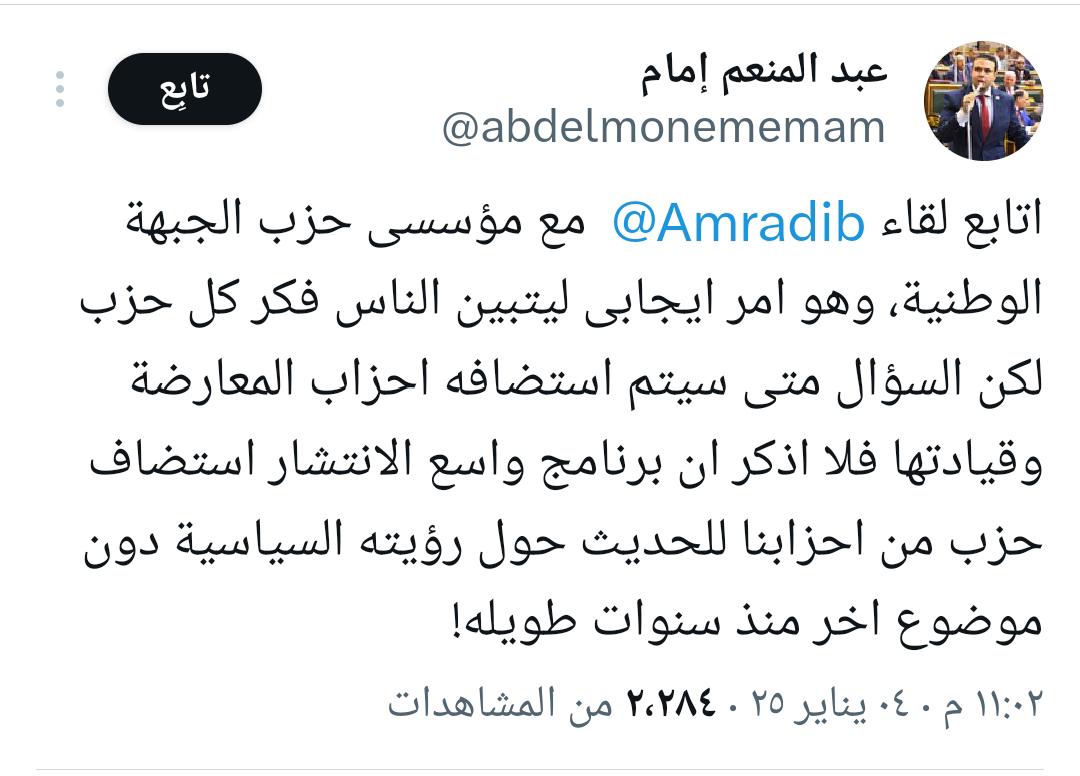 بعد لقاء الجزار ورشوان مع عمرو أديب.. النائب عبد المنعم إمام يطالب بفتح المجال الإعلامي لاستضافة أحزاب المعارضة