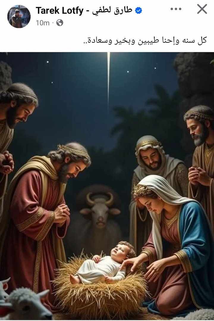 آثار الفنان طارق لطفي حالة من الجدل في الساعات الماضية حول ديانته، وذلك بعد منشور احتفاله مع المسحيين بعيد الميلاد المجيد وهتنئته لهم بطريقة غريبة توحي بأنه على يقين بعقيدتهم.