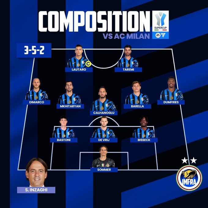 تشكيل انتر ميلان الرسمي ضد ميلان في نهائي كأس السوبر الإيطالي