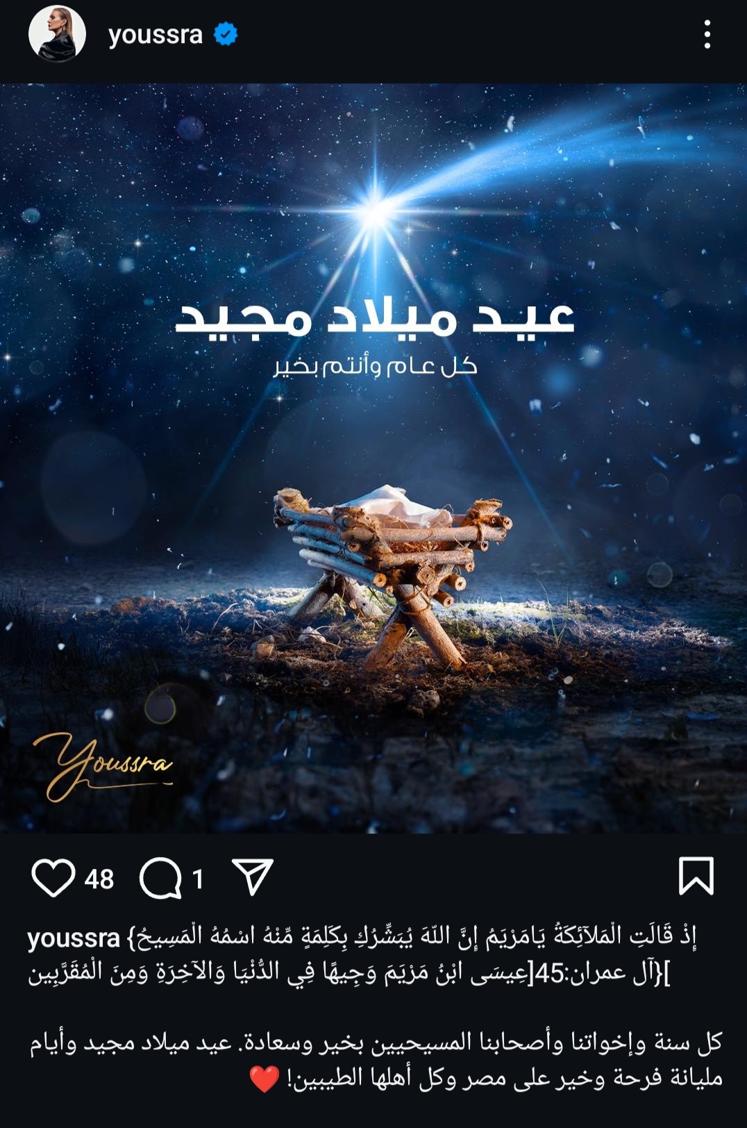 أرفقت يسرا تهنئة إلى جمهورها عبر حسابها الرسمي على موقع تبادل الصور والفيديوهات انستجرام وعلقت يسرا موجهة لجمهورها رسالة خاصة بمناسبة حلول عيد الميلاد المجيد، وكتبت في منشور يرصده موقع تحيا مصر: "كل سنة واخواتنا واصحابنا المسيحيين بخير وسعادة.. عيد ميلاد مجيد وأيام مليانة فرحة وخير على مصر وكل أهلها الطيبين"، علق عدد كبير من الجمهور ومتابعين يسرا على منشورها والذين قدموا التهاني لبعضهما وأعربوا عن سعادتهم.