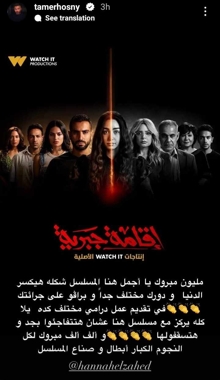 وكتب تامر حسني في منشور رصده موقع تحيا مصر عبر حسابه الرسمي بموقع تبادل الصور والفيديوهات انستجرام عبر خاصية ستوري: مليون مبروك يا أجمل هنا المسلسل شكله هيكسر الدنيا ودورك مختلف جدا وبرافو على جرائتك في تقديم عمل درامي مختلف كدة.