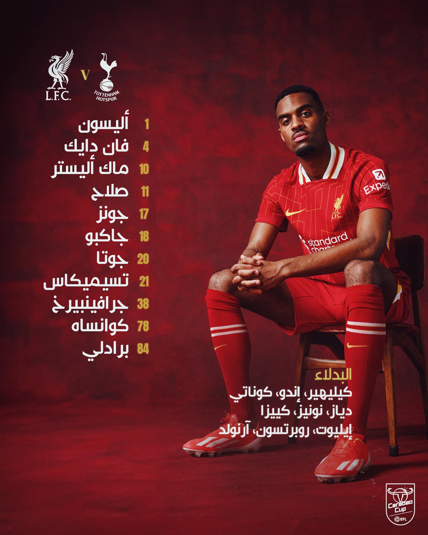 أعلن الهولندي أرني سلوت المدير الفني للفريق الكروي الأول بنادي ليفربول الإنجليزي، تشكيل فريقه لمواجهة فريق توتنهام والتي ستنطلق الليلة في تمام الساعة العاشرة مساء، في ذهاب نصف نهائي كأس رابطة المحترفين الإنجليزية.