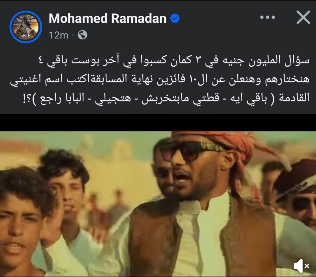 أرفق الفنان محمد رمضان منشور عبر حسابه الرسمي على موقع التواصل الاجتماعي فيسبوك أعلن من خلاله ربح 6 أشخاص في مسابقته الأخيرة التي تبلغ قيمة جائزتها مليون جنيه، وحمس محمد رمضان جمهوره بهذا المنشور الذي لاقى تفاعل كبير من جمهور محمد رمضان محاولين الوصول إلى الإجابة الصحيحة، وكتب محمد رمضان في منشوره الذي يرصده موقع تحيا مصر: "سؤال المليون جنيه في ٣ كمان كسبوا في آخر بوست باقي ٤ هنختارهم وهنعلن عن ال١٠ فائزين نهاية المسابقة اكتب اسم اغنيتي القادمة ( باقي ايه - قطتي مابتخربش - هتجيلي - البابا راجع )؟!"