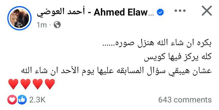 وكتب أحمد العوضي في منشور رصده موقع تحيا مصر عبر حسابه الرسمي بموقع التواصل الاجتماعي فيسبوك: بكره ان شاء الله هنزل صورة، كله يركز فيها كويس عشان هيبقي سؤال المسابقه عليها يوم الأحد ان شاء الله.