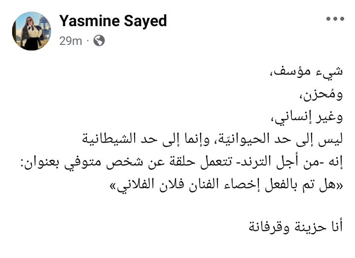 وكتبت ياسمين الخطيب في منشور رصده موقع تحيا مصر عبر حسابها الرسمي بموقع التواصل الاجتماعي فيسبوك: "شيء مؤسف، ومُحزن، وغير إنساني، ليس إلى حد الحيوانيّة، وإنما إلى حد الشيطانية إنه -من أجل الترند- تتعمل حلقة عن شخص متوفي بعنوان: «هل تم بالفعل إخصاء الفنان فلان الفلاني»، أنا حزينة وقرفانة".