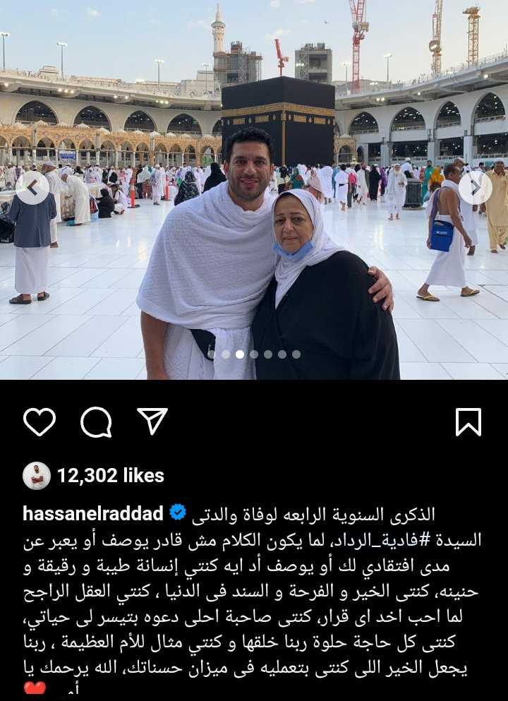 وكتب حسن الرداد في منشور رصده موقع تحيا مصر عبر حسابه الرسمي بموقع تبادل الصور والفيديوهات انستجرام: السيدة فادي الرداد، لما يكون الكلام مش قادر يوصف أو يعبر عن مدى افتقادي لك أو يوصف أد ايه كنتي إنسانة طيبة و رقيقة و حنينه، كنتى الخير و الفرحة و السند فى الدنيا ، كنتي العقل الراجح لما احب اخد اى قرار، كنتى صاحبة احلى دعوه بتيسر لى حياتي، كنتى كل حاجة حلوة ربنا خلقها و كنتي مثال للأم العظيمة ، ربنا يجعل الخير اللى كنتى بتعمليه فى ميزان حسناتك، الله يرحمك يا أمي.