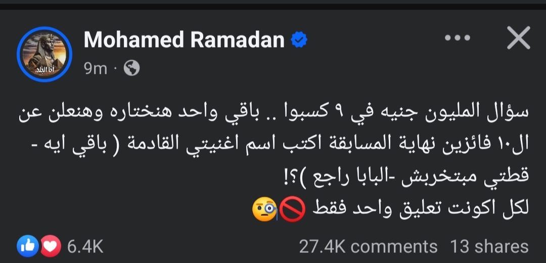 حمس الفنان محمد رمضان الجمهور لمسابقته الجديدة وجائزتها مليون جنيه، حيث أعلن أنه تم اختيار 9 فائزين وباقي واحد فقط وعندما يتم اختياره سيتم الإعلان عن أسماء الـ 10 الفائزين، وأكد محمد رمضان في منشور عبر حسابه الرسمي على موقع التواصل الاجتماعي فيسبوك يرصده موقع تحيا مصر أنه سيقوم بتسليم الجائزة بنفسه للفائزين، وكتب محمد رمضان: "سؤال المليون جنيه في ٩ كسبوا .. باقي واحد هنختاره وهنعلن عن ال١٠ فائزين نهاية المسابقة اكتب اسم أغنيتي القادمة ( باقي ايه - قطتي مبتخربش -البابا راجع )"، وشهد منشور محمد رمضان تفاعل عدد ضخم من متابعينه ومحبينه الذين يحاولون الوصول إلى الإجابة الصحيحة لربح المسابقة.