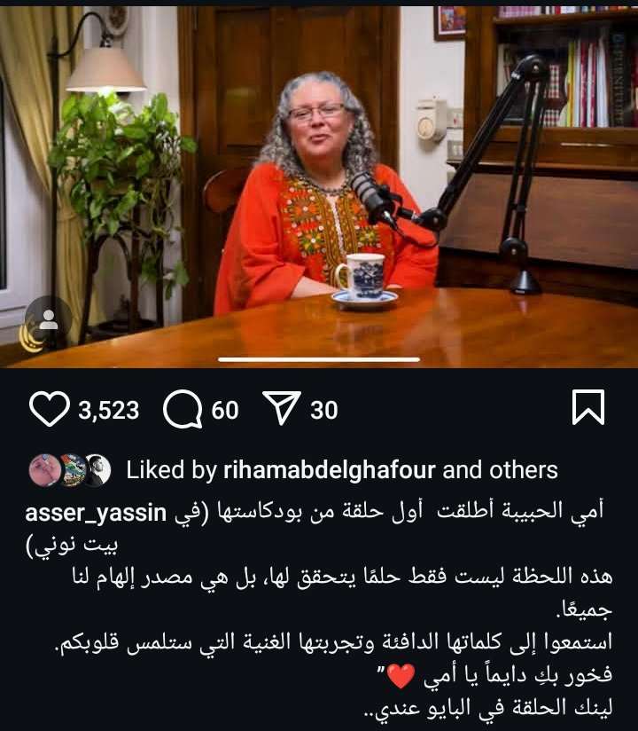 ونشر آسر ياسين صورة لوالدته من بودكاست بيت نوني عبر حسابه الرسمي بموقع تبادل الصور والفيديوهات انستجرام في منشور رصده موقع تحيا مصر، وعلقت عليه، قائلة: أمي الحبيبة أطلقت أول حلقة من بودكاستها (في بيت نوني) هذه اللحظة ليست فقط حلمًا يتحقق لها، بل هي مصدر إلهام لنا جميعًا، استمعوا إلى كلماتها الدافئة وتجربتها الغنية التي ستلمس قلوبكم، فخور بكِ دايماً يا أمي.