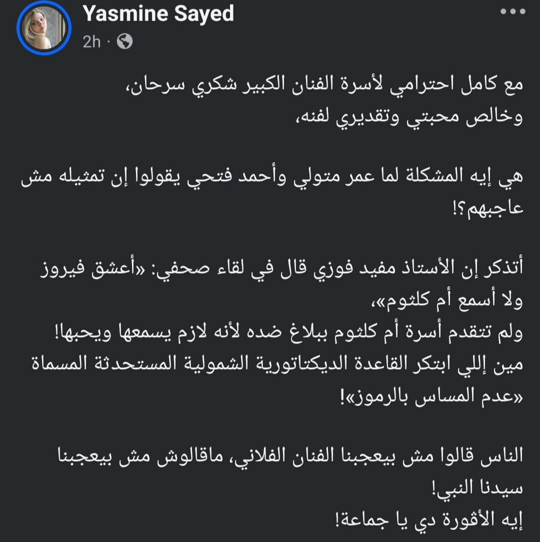 تابعت الإعلامية ياسمين الخطيب حديثها واستشهدت بموقف للإعلامي الراحل مفيد فوزي كان تحدث فيه عن كوكب الشرق أم كلثوم مشيرًا إلى أنه لم يفضل سماعها، وقالت ياسمين الخطيب: "أتذكر إن الأستاذ مفيد فوزي قال في لقاء صحفي: «أعشق فيروز ولا أسمع أم كلثوم»، ولم تتقدم أسرة أم كلثوم ببلاغ ضده لأنه لازم يسمعها ويحبها!.. مين إللي ابتكر القاعدة الديكتاتورية الشمولية المستحدثة المسماة «عدم المساس بالرموز».. الناس قالوا مش بيعجبنا الفنان الفلاني، ماقالوش مش بيعجبنا سيدنا النبي، ايه الأڤورة دي يا جماعة".