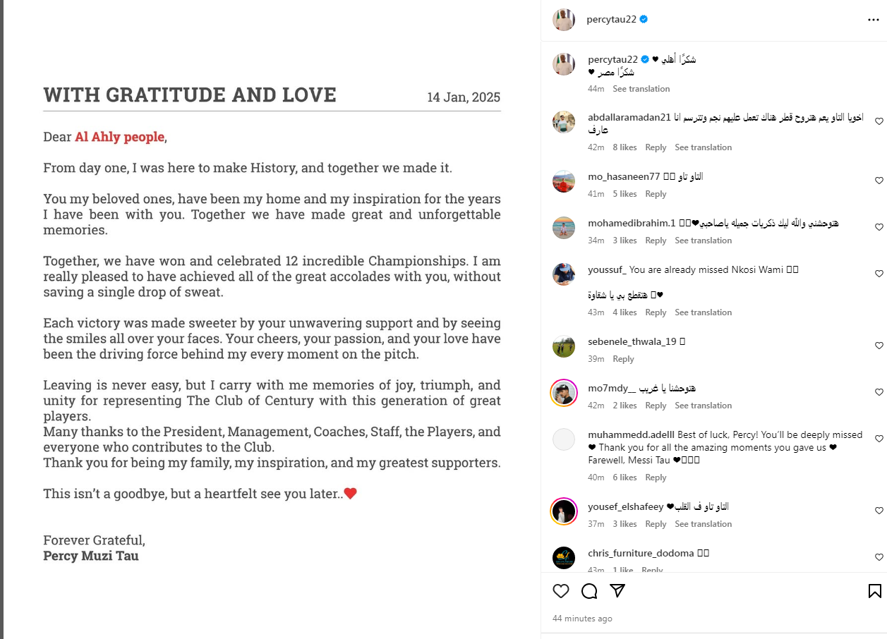 تحيا مصر، وكتب بيرسي تاو عبر حسابه الرسمي"إنستجرام":"شعب الاهلي العزيزمنذ اليوم الأول، كنت هنا لأصنع التاريخ، وقد صنعناه معًا.