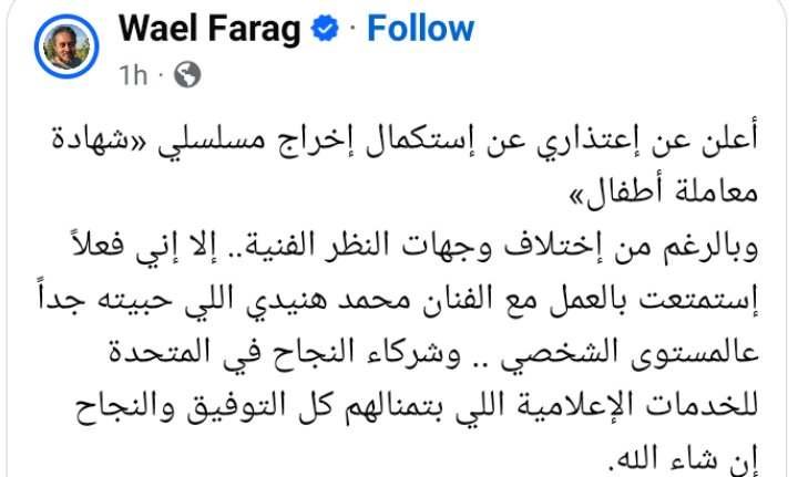 وكتب وائل فرج في منشور رصده موقع تحيا مصر عبر حسابه الرسمي بموقع التواصل الاجتماعي فيسبوك: أعلن عن إعتذاري عن إستكمال إخراج مسلسلي شهادة معاملة أطفال وبالرغم من إختلاف وجهات النظر الفنية.. إلا إني فعلاً إستمتعت بالعمل مع الفنان محمد هنيدي اللي حبيته جداً عالمستوى الشخصي .. وشركاء النجاح في المتحدة للخدمات الإعلامية اللي بتمنالهم كل التوفيق والنجاح إن شاء الله.
