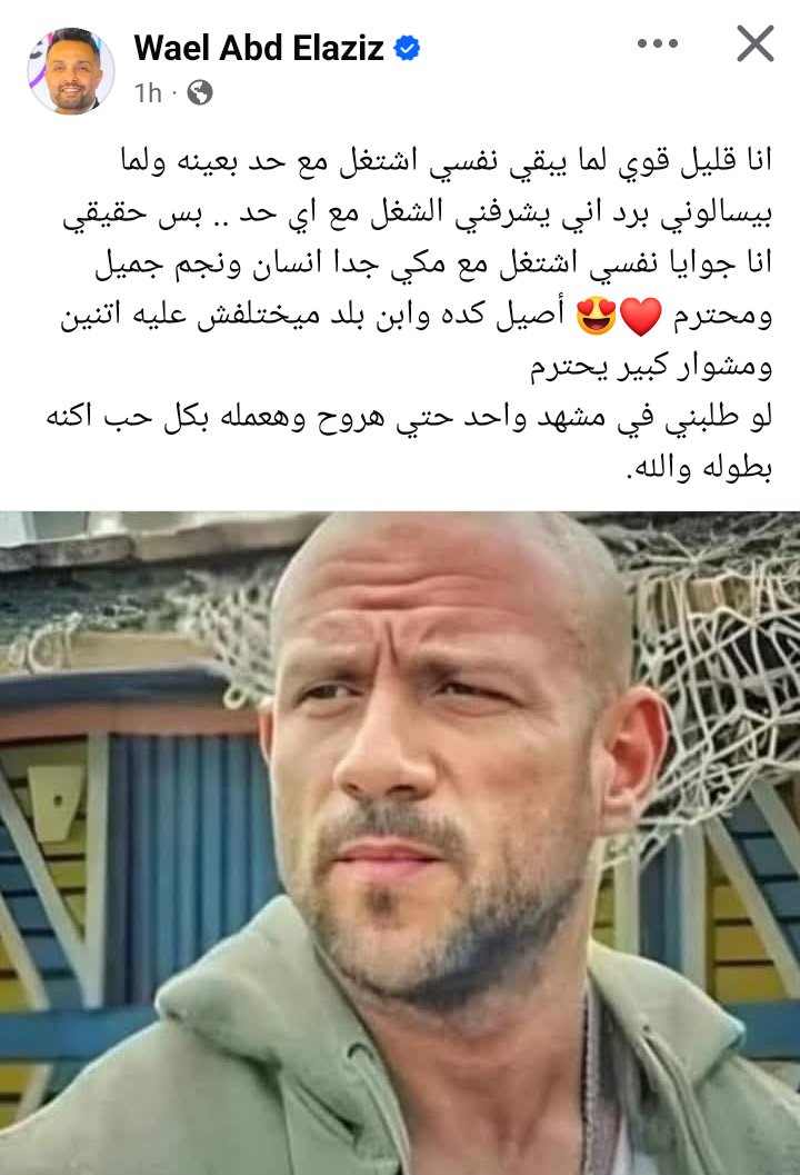 وكتب وائل عبد العزيز في منشور رصده موقع تحيا مصر عبر حسابه الرسمي بموقع التواصل الاجتماعي فيسبوك: انا قليل قوي لما يبقي نفسي اشتغل مع حد بعينه ولما بيسالوني برد اني يشرفني الشغل مع اي حد .. بس حقيقي انا جوايا نفسي اشتغل مع مكي جدا انسان ونجم جميل ومحترم، أصيل كده وابن بلد ميختلفش عليه اتنين ومشوار كبير يحترم ولو طلبني في مشهد واحد حتي هروح وهعمله بكل حب اكنه بطوله والله.