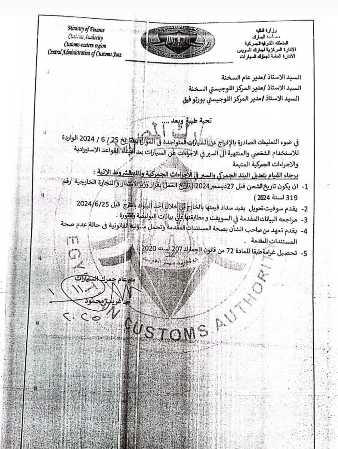ووفقًا لهذا القرار، يشترط تقديم مستند سويفت من البنك يفيد بسداد قيمة المبلغ المخصص لشراء السيارة قبل 25 يونيو 2024.