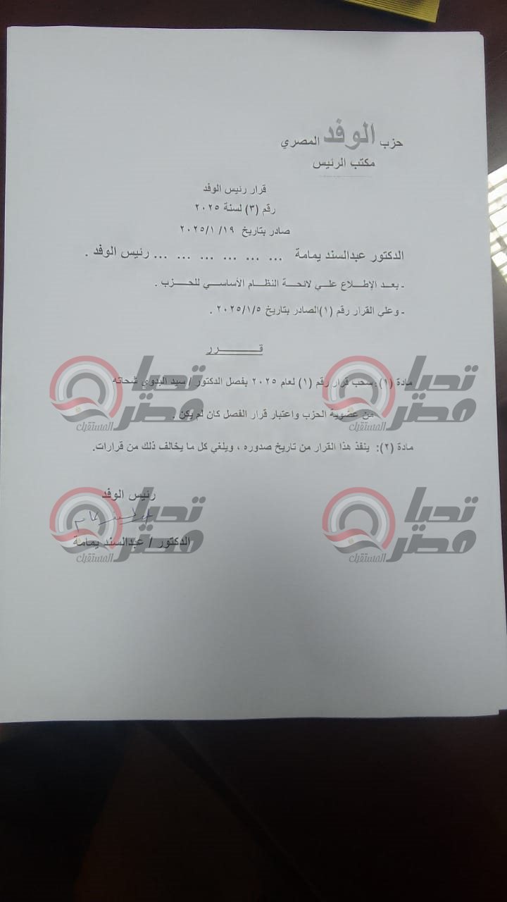 ون ص القرار على أنه بعد الإطلاع على لائحة النظام الأساسي للحزب. وعلى القرار رقم (۱) الصادر بتاريخ ٢٠٢٥/١/٥، قرر سحب قرار رقم 1 لعام 2025 بفصل الدكتور سيد البدوي شحاته من عضوية الحزب واعتبار قرار الفصل كأن لم يكن.