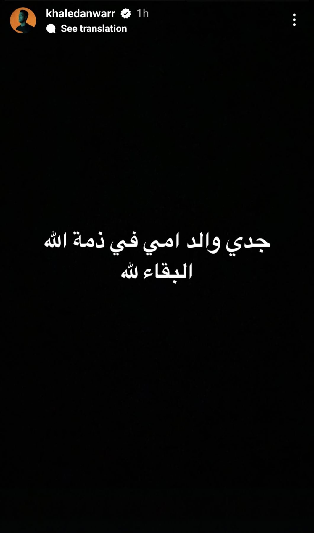 أعلن الفنان الشاب خالد أنور وفاة جده، وذلك من خلال منشور عبر حسابه الشخصي على موقع تبادل الصور والفيديوهات إنستجرام من خلال خاصية استوري.