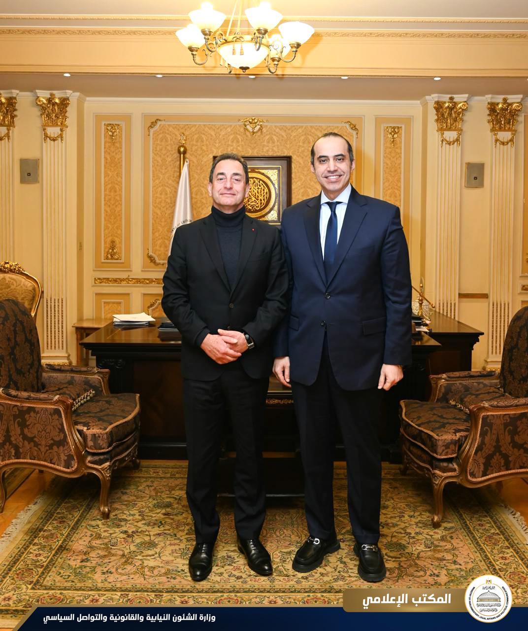 استقبل المستشار محمود فوزي، وزير الشئون النيابية والقانونية والتواصل السياسي، السفير إيريك شوفالييه، سفير فرنسا بمصر، بحضور السفيرة دينا الصيحي، مساعد وزير الخارجية للشئون البرلمانية، وذلك بمقر الوزارة بالقصر العيني.