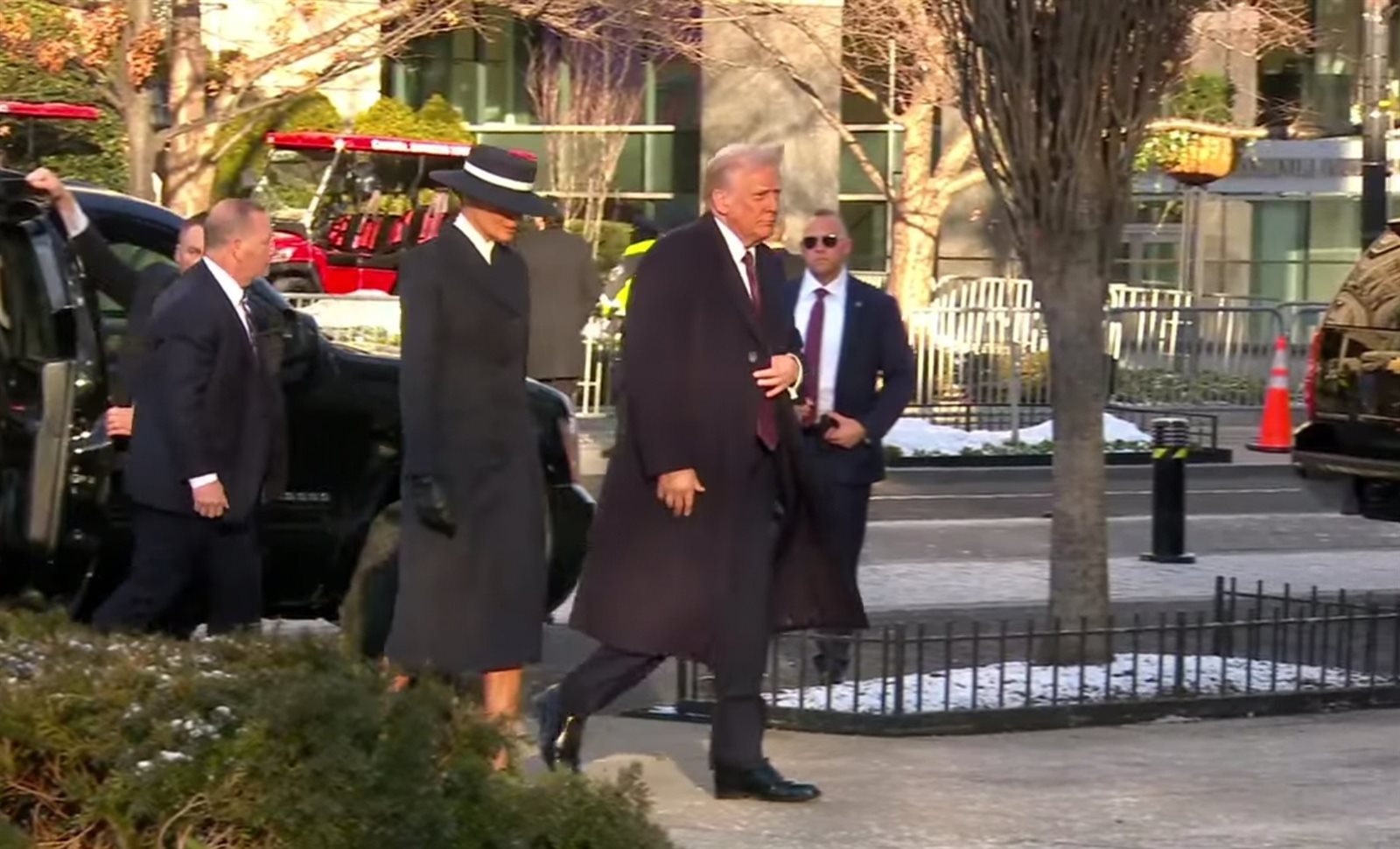 وظهر ترامب في اللقطات المصورة وهو يرتدي بدلة ومعطفًا مفتوح الأزرار وربطة عنق كستنائية اللون، وهو يبتسم ويرفع قبضته عند وصوله إلى الكنيسة. فيما ظلت ميلانيا ترتدي قبعة سوداء أنيقة ومعطفًا، وحافظت على هدوئها بينما كانت تمسك بيد زوجها.