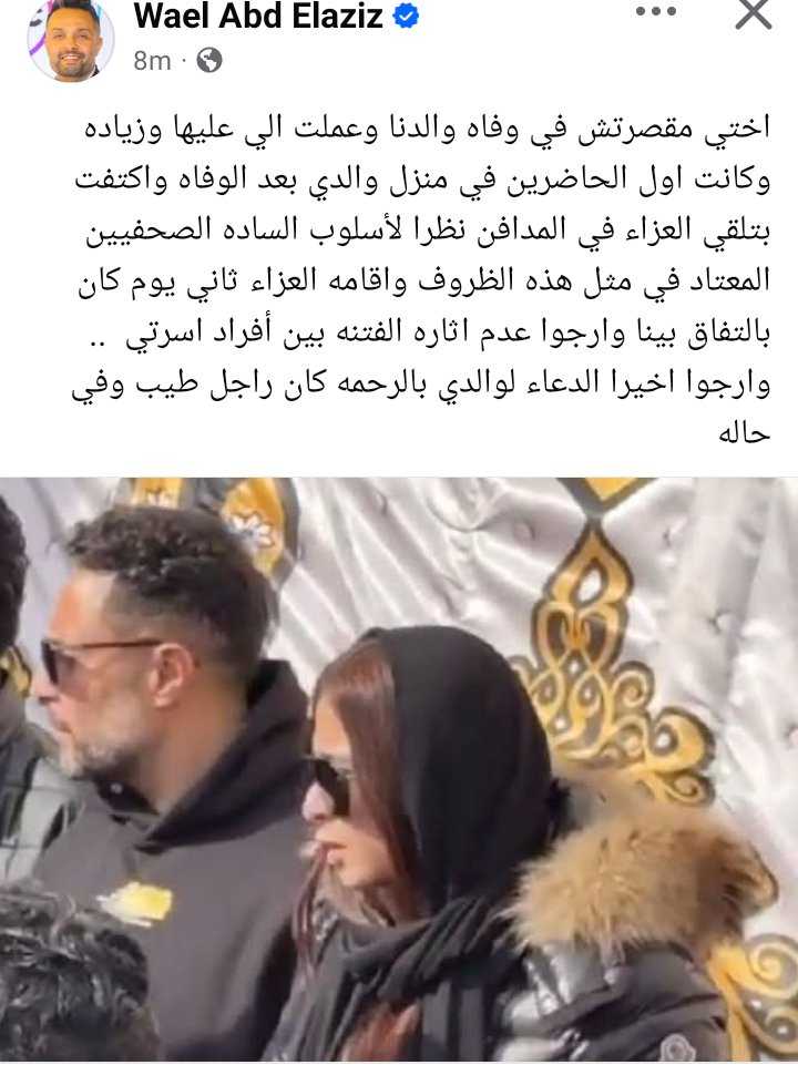وكتب وائل عبد العزيز في منشور رصده موقع تحيا مصر على حسابه الرسمي بموقع التواصل الاجتماعي فيسبوك: اختي مقصرتش في وفاه والدنا وعملت الي عليها وزياده وكانت اول الحاضرين في منزل والدي بعد الوفاه واكتفت بتلقي العزاء في المدافن نظرا لأسلوب بعض السادة الصحفيين او أصحاب المواقع المعتاد في مثل هذه الظروف واقامه العزاء ثاني يوم كان بالتفاق بينا وارجوا عدم اثاره الفتنه بين أفراد أسرتي.. أخيرا فضلا الدعاء لوالدي بالرحمه كان راجل طيب وفي حاله لله ما اخذ وله ما أعطى وكل شيء عنده بأجل مسمى.