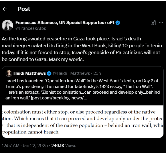 من جهة أخرى، حذرت المقررة الأممية الخاصة بحقوق الإنسان في الأراضي الفلسطينية، فرانشيسكا ألبانيز، من أن التصعيد الإسرائيلي في الضفة الغربية قد يفضي إلى ارتكاب جرائم إبادة جماعية ضد الفلسطينيين، على غرار ما جرى في قطاع غزة.