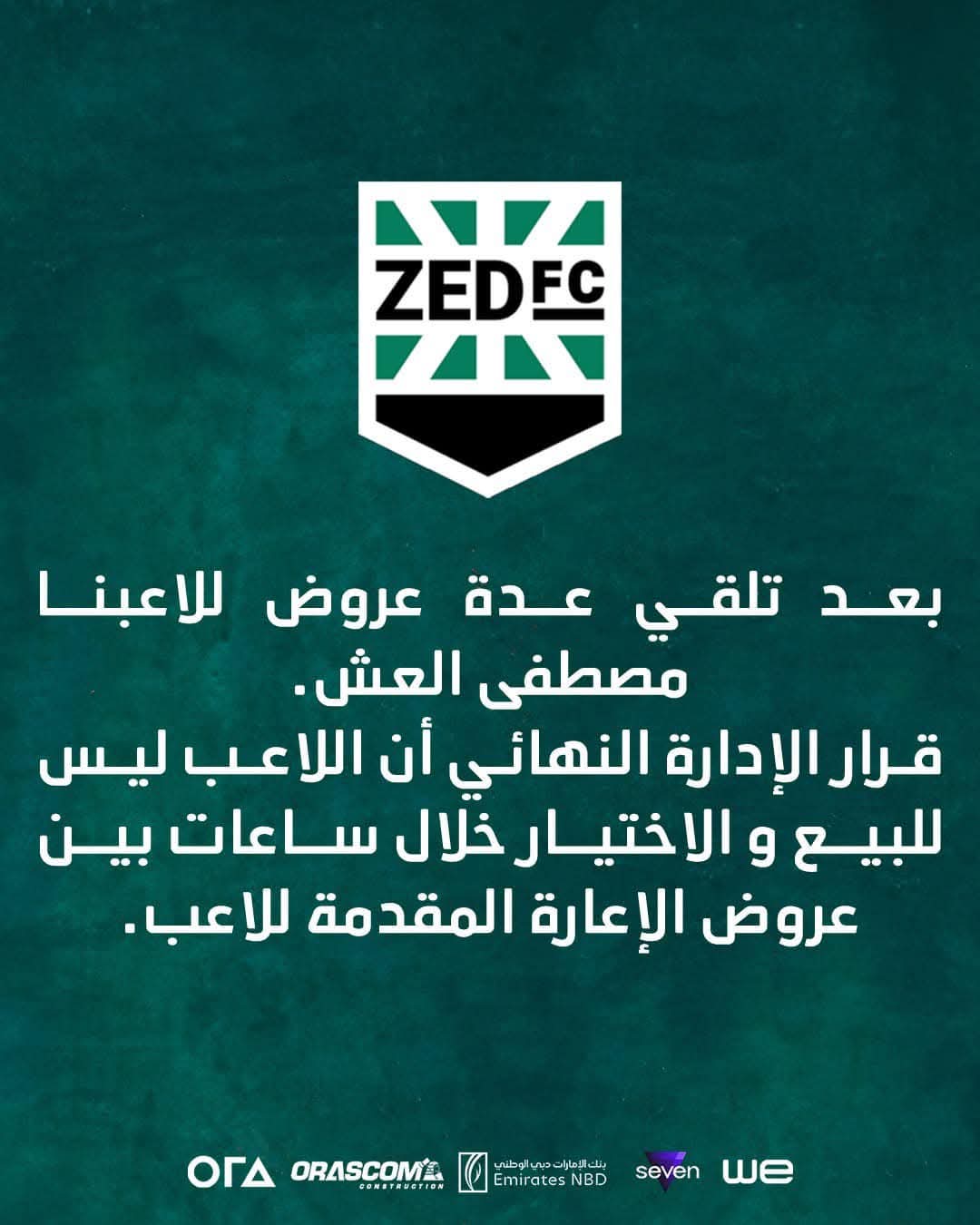 "بعد تلقي عدة عروض للاعبنا مصطفى العش، قرار الإدارة النهائي أن اللاعب ليس للبيع والاختيار خلال ساعات بين عروض الإعارة المقدمة للاعب".