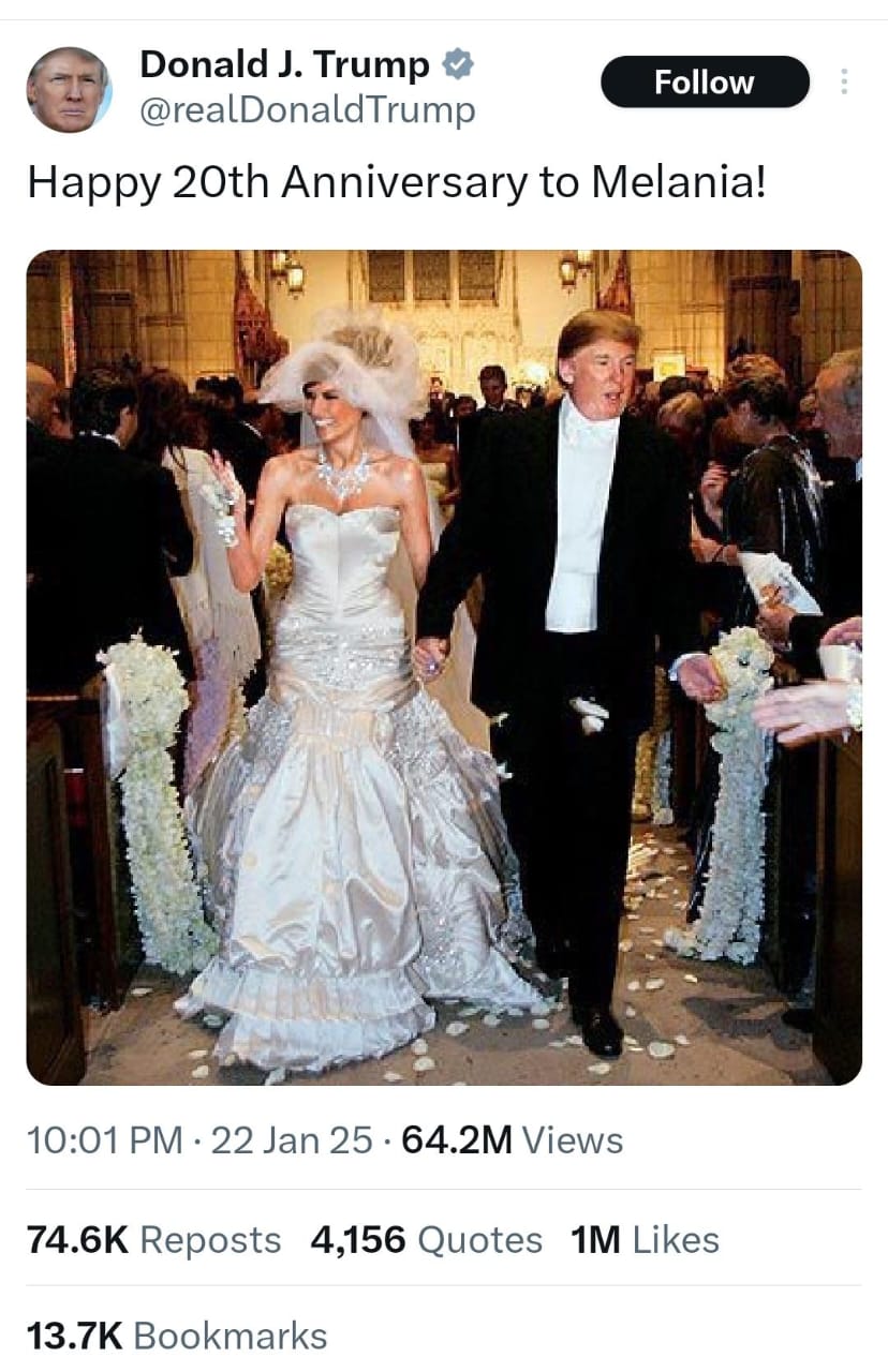 في احتفالٍ خاص عبر منصات التواصل الاجتماعي، نشر الرئيس الأميركي دونالد ترامب صورة من حفل زفافه الذي أقيم في 22 يناير 2005، معبرًا عن سعادته بمرور 20 عامًا على زواجه من ميلانيا ترامب.