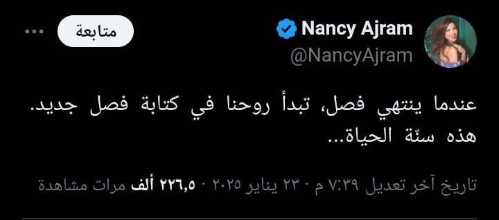 وكتبت نانسي عجرم في منشور رصده موقع تحيا مصر عبر موقع التدوينات القصيرة إكس: "عندما ينتهي فصل، تبدأ روحنا في كتابة فصل جديد هذه سنّة الحياة".