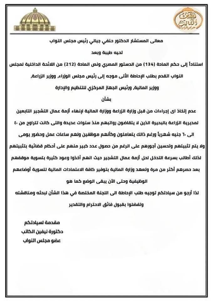 تقدمت النائبة الدكتورة نيفين الكاتب، عضو مجلس النواب وأمينة المرأة بحزب مستقبل وطن بمحافظة البحيرة، بطلب إحاطة إلى المستشار الدكتور حنفي جبالي، رئيس مجلس النواب، موجه إلى الدكتور مصطفى مدبولي، رئيس مجلس الوزراء، ووزير الزراعة واستصلاح الأراضي، ووزير المالية، ورئيس الجهاز المركزي للتنظيم والإدارة، بشأن حل أزمة عمال التشجير التابعين لوزارة الزراعة، وذلك لاتخاذ الإجراءات اللازمة لتثبيتهم على درجات مالية.