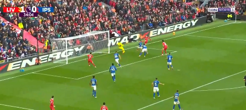 واستلم محمد صلاح الكرة بشكل رائعة بعد كرة بالمقاس من كودي جاكبو واستلم محمد صلاح الكرة داخل منطقة الجزاء ولعب الكرة في سقف المرمى ولم يتمكن حارس إبسويتش تاون في التعامل مع الكرة.